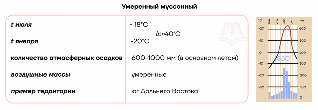 Муссонный климат умеренных широт преобладает на Дальнем Востоке России (Приморье, среднее течение реки Амур), на севере Японии, а также на северо-востоке Китая. Зимой он формируется вследствие выноса континентальных воздушных масс на периферию азиатского антициклона, а летом на его возникновение влияют морские воздушные массы. Все показатели (количество осадков, температура, влажность) разнятся в течение года, самые высокие отметки наблюдаются летом.