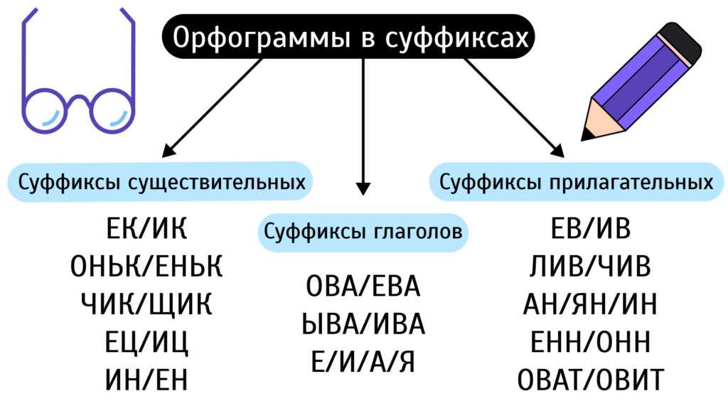 В таблице выше мы также привели примеры основных орфограмм в суффиксах.