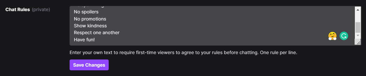 - Lastly, go to the left panel of the Moderation page and scroll down to Channel Privileges. Navigate to the Chat Rules section, and type in your chat rules, one rule per line. When you’re done, click Save Changes. Your chat rules will now pop up when a viewer first logs in to your chat as a reminder of your channel’s rules.