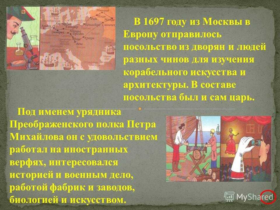 В 1697 году из Москвы в Европу отправилось посольство из дворян и людей разных чинов для изучения корабельного искусства и архитектуры. В составе посольства был и сам царь. Под именем урядника Преображенского полка Петра Михайлова он с удовольствием работал на иностранных верфях, интересовался историей и военным дело, работой фабрик и заводов, биологией и искусством. 7