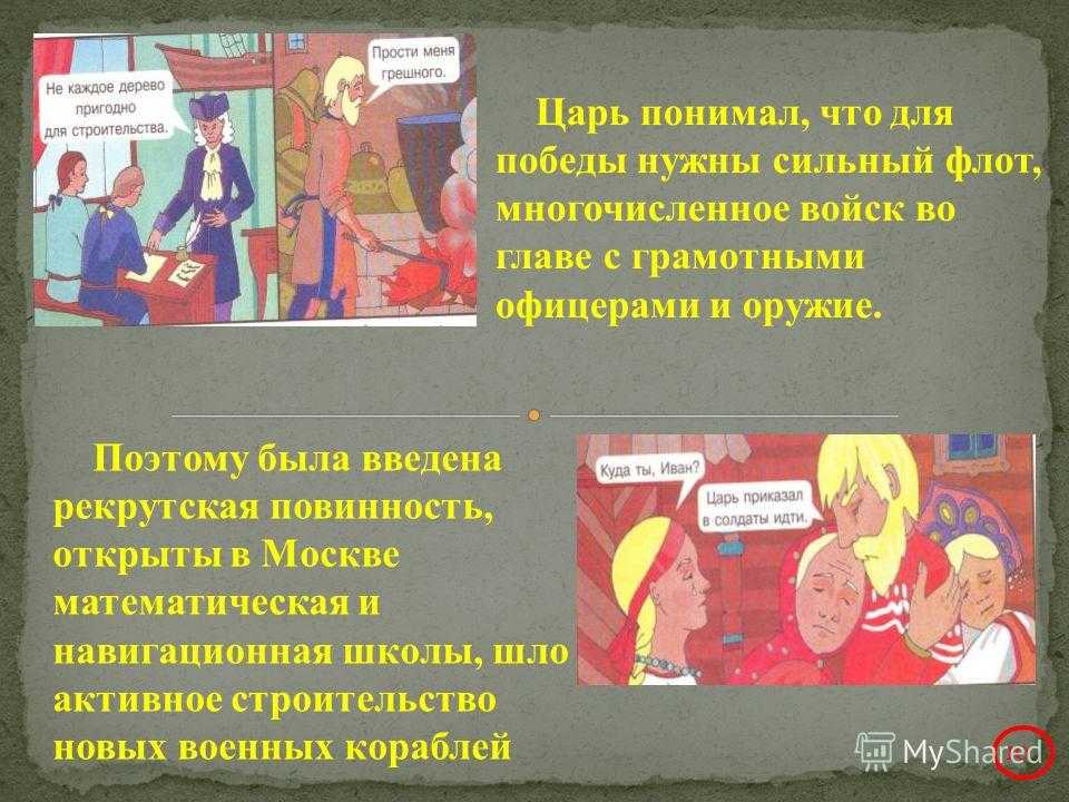 Царь понимал, что для победы нужны сильный флот, многочисленное войск во главе с грамотными офицерами и оружие. Поэтому была введена рекрутская повинность, открыты в Москве математическая и навигационная школы, шло активное строительство новых военных кораблей 10