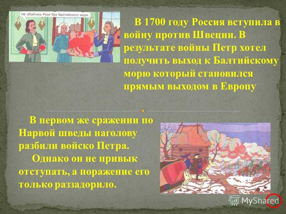 В 1700 году Россия вступила в войну против Швеции. В результате войны Петр хотел получить выход к Балтийскому морю который становился прямым выходом в Европу В первом же сражении по Нарвой шведы наголову разбили войско Петра. Однако он не привык отступать, а поражение его только раззадорило. 9