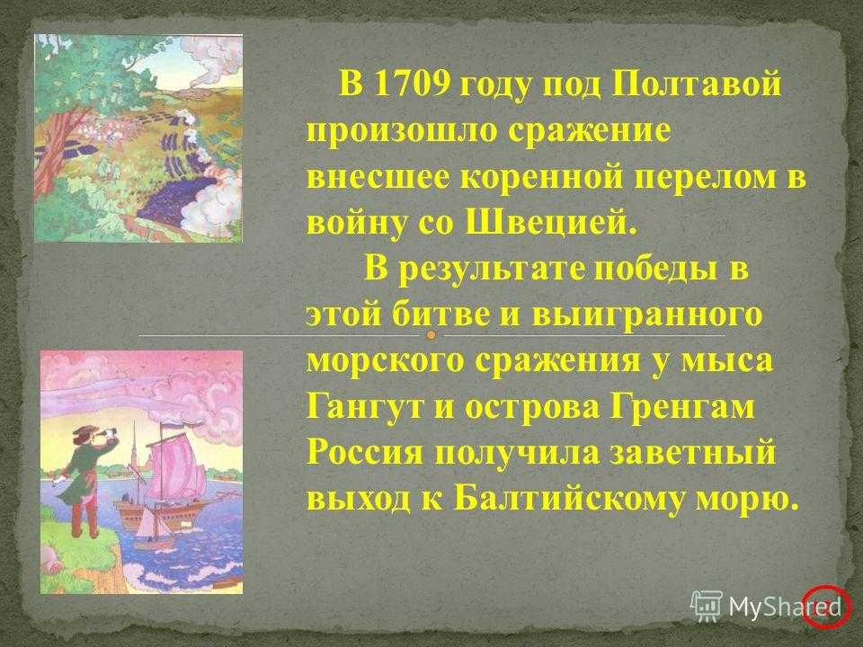В 1709 году под Полтавой произошло сражение внесшее коренной перелом в войну со Швецией. В результате победы в этой битве и выигранного морского сражения у мыса Гангут и острова Гренгам Россия получила заветный выход к Балтийскому морю. 12
