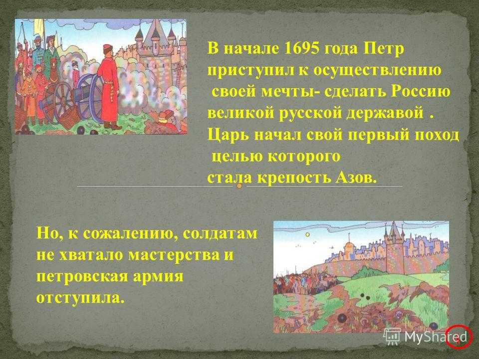 В начале 1695 года Петр приступил к осуществлению своей мечты- сделать Россию великой русской державой. Царь начал свой первый поход целью которого стала крепость Азов. Но, к сожалению, солдатам не хватало мастерства и петровская армия отступила. 4