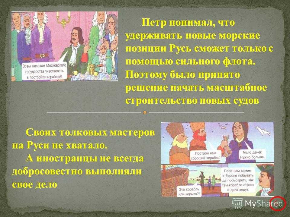 Петр понимал, что удерживать новые морские позиции Русь сможет только с помощью сильного флота. Поэтому было принято решение начать масштабное строительство новых судов Своих толковых мастеров на Руси не хватало. А иностранцы не всегда добросовестно выполняли свое дело 6