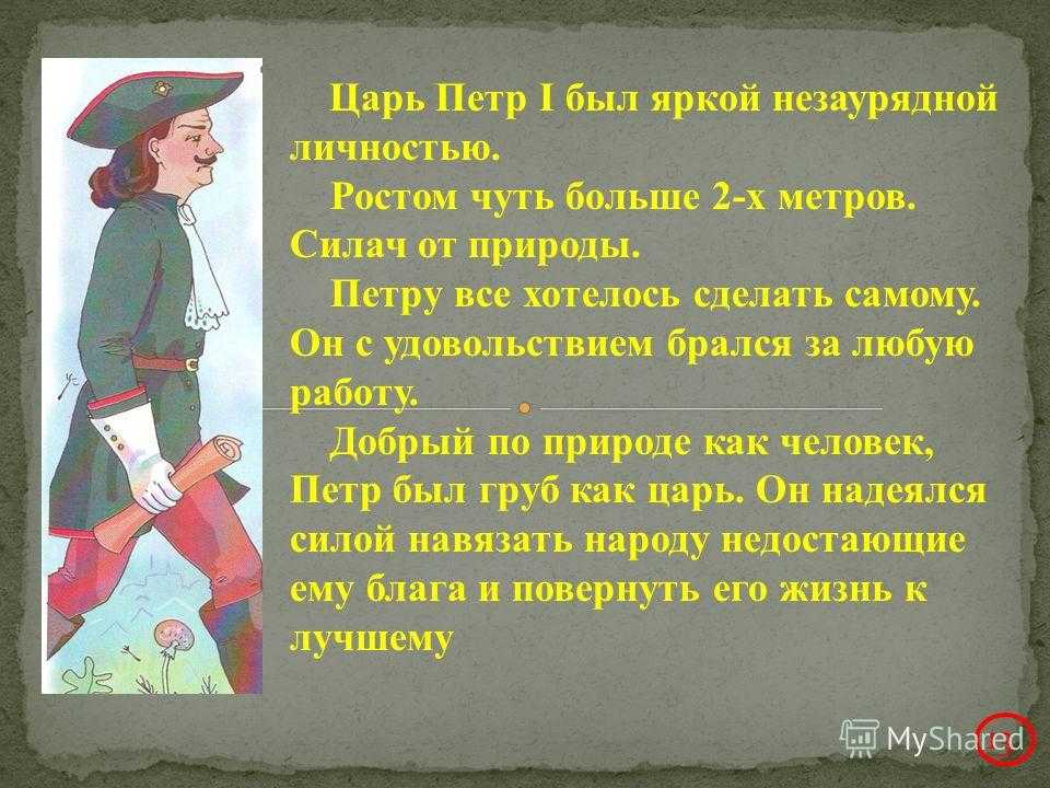 Царь Петр I был яркой незаурядной личностью. Ростом чуть больше 2-х метров. Силач от природы. Петру все хотелось сделать самому. Он с удовольствием брался за любую работу. Добрый по природе как человек, Петр был груб как царь. Он надеялся силой навязать народу недостающие ему блага и повернуть его жизнь к лучшему 13