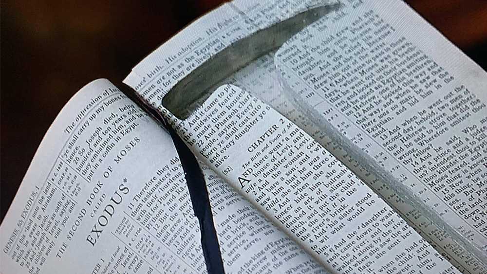 На экране на несколько секунд появляется открытая Библия и хорошо видно, как вырезаны страницы для тайного хранения инструмента. Но и полная страница с заголовком: Exodus (Исход) тоже видна).