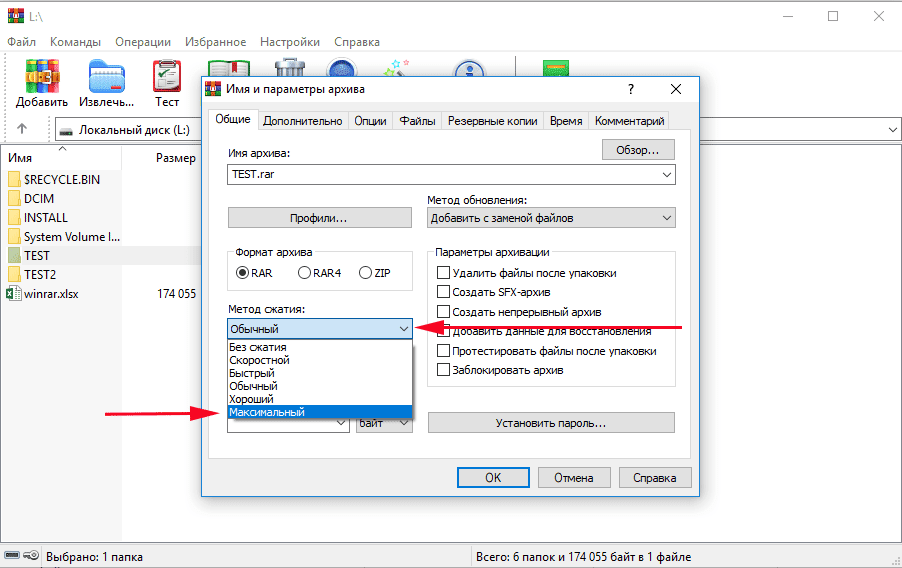 - Перед вами откроется меню параметров. Для максимального сжатия остановимся на формате RAR.