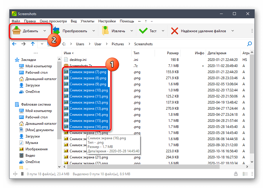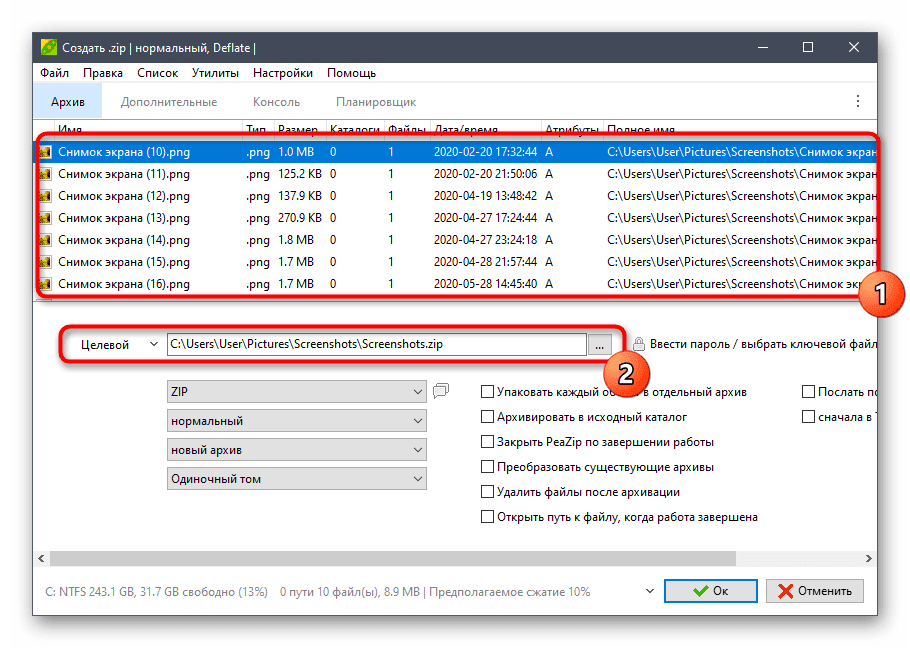 - При работе с файловым менеджером PeaZip просто выделяйте все файлы и нажимайте по кнопке «Добавить».