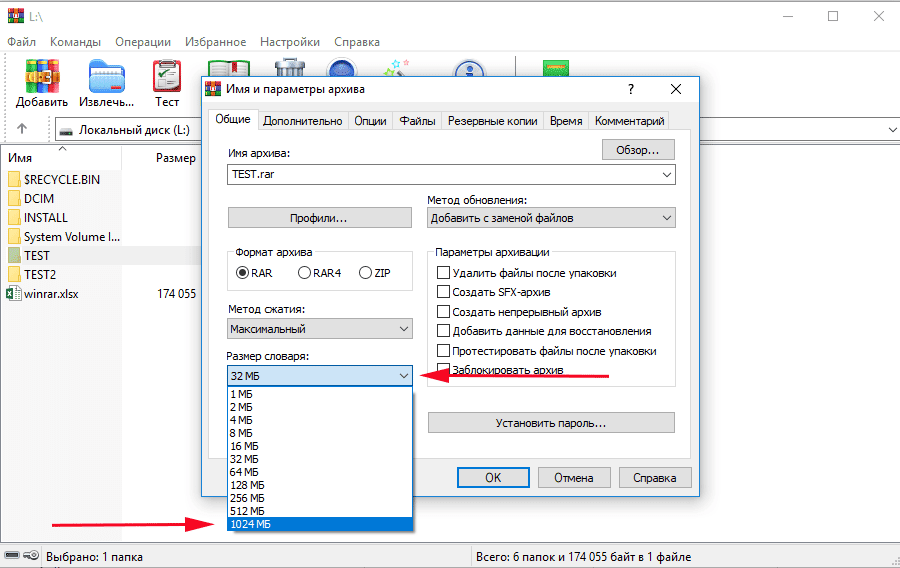 - В меню «Размер словаря» задайте значение 1024 МБ, чтобы уменьшить вес архива.