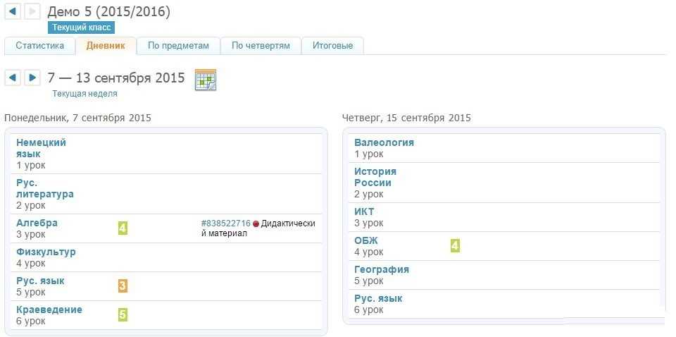 - Просмотр оценок по всем предметам (за день, четверть, семестр и год);