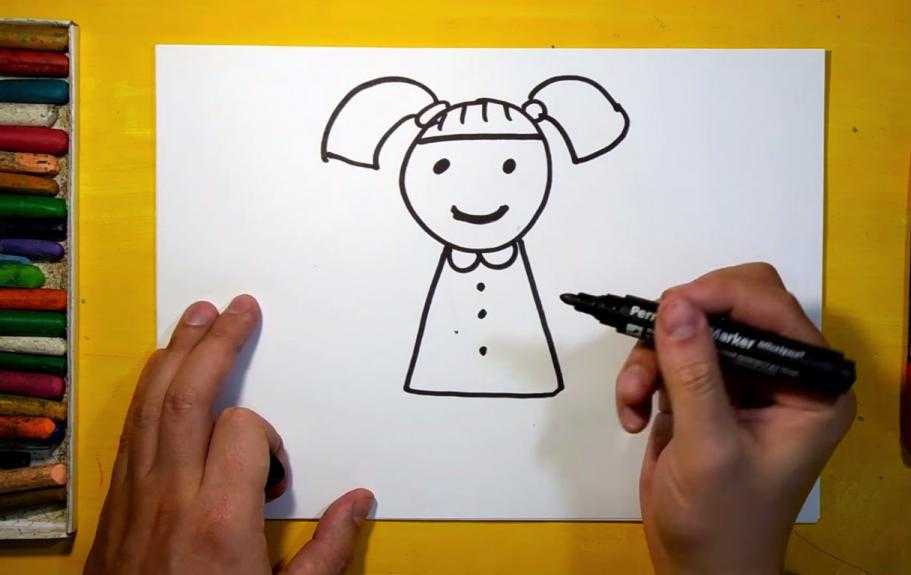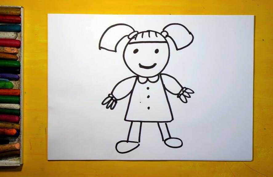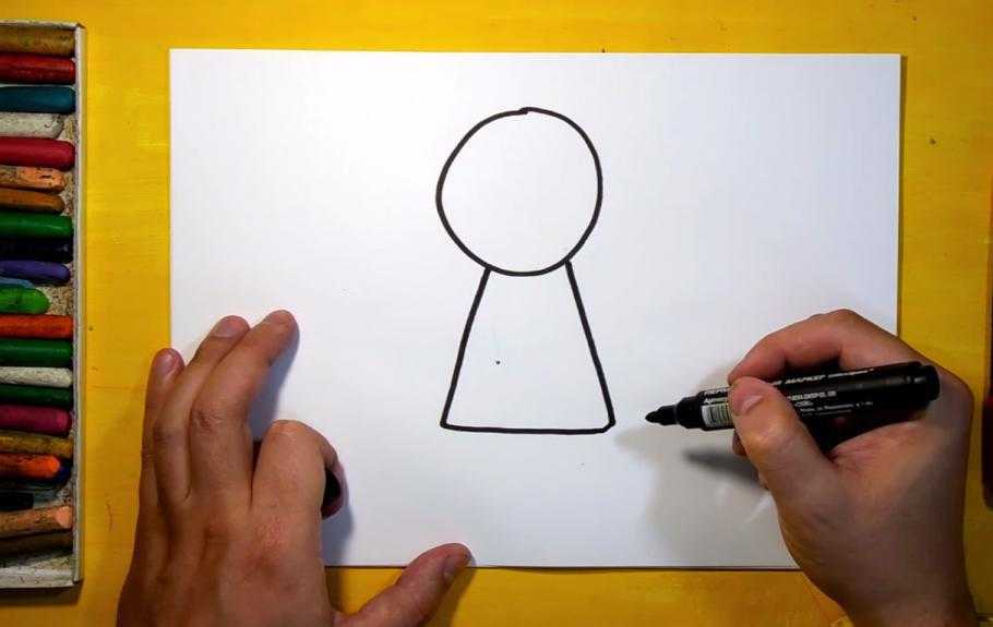 Сначала рисуем круг — это голова. В этом кругу рисуем лицо: глаза, нос, рот, волосы. Ниже рисуем треугольник платья или овальное туловище. Затем добавляем руки и ноги. Совсем как в детской песенке: quot;Палка-палка, огуречик, получился человечекquot;