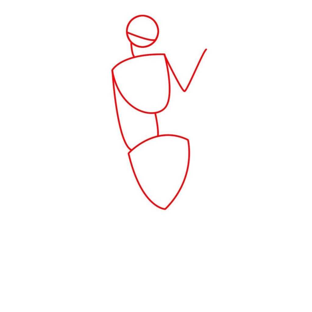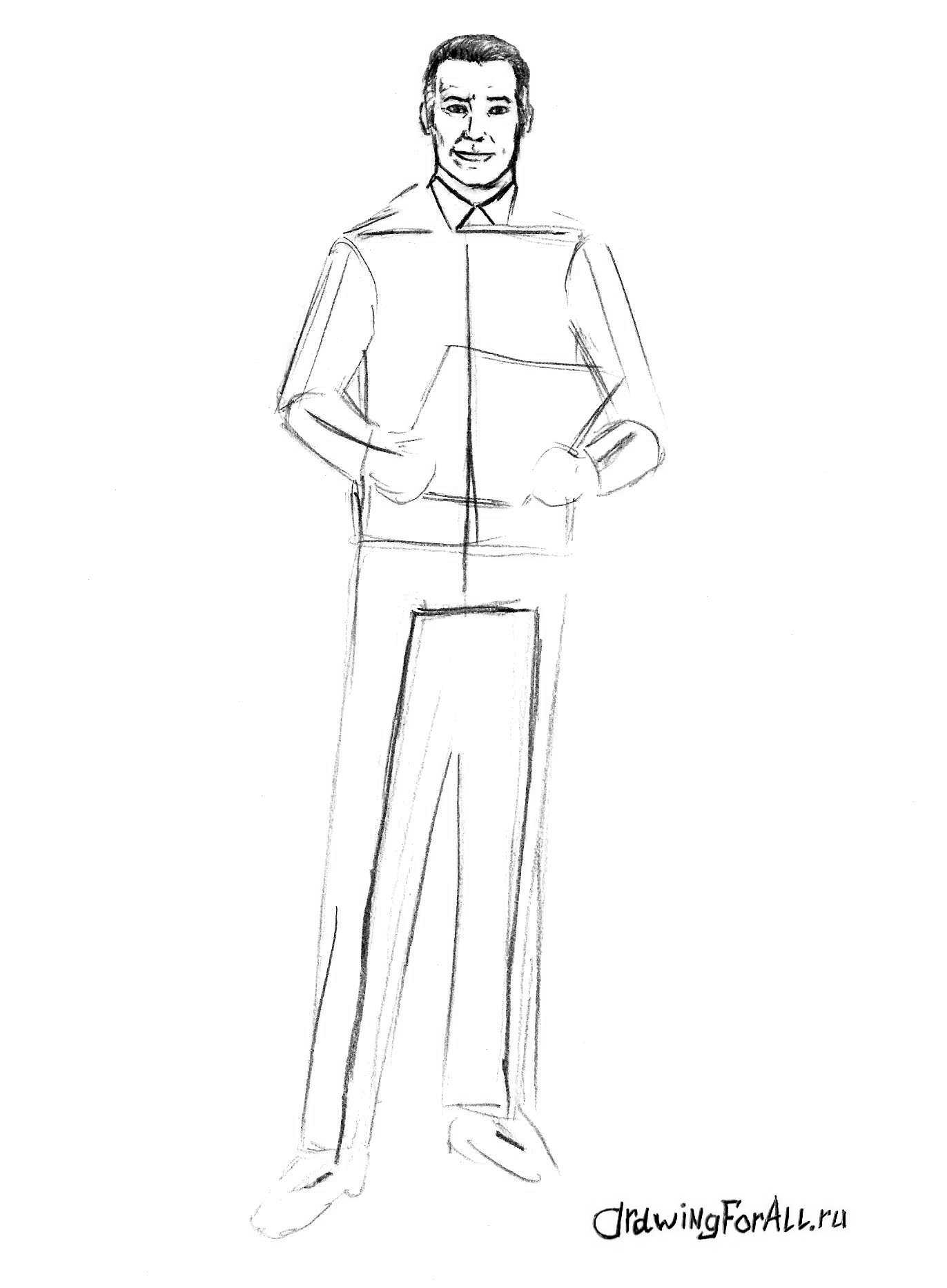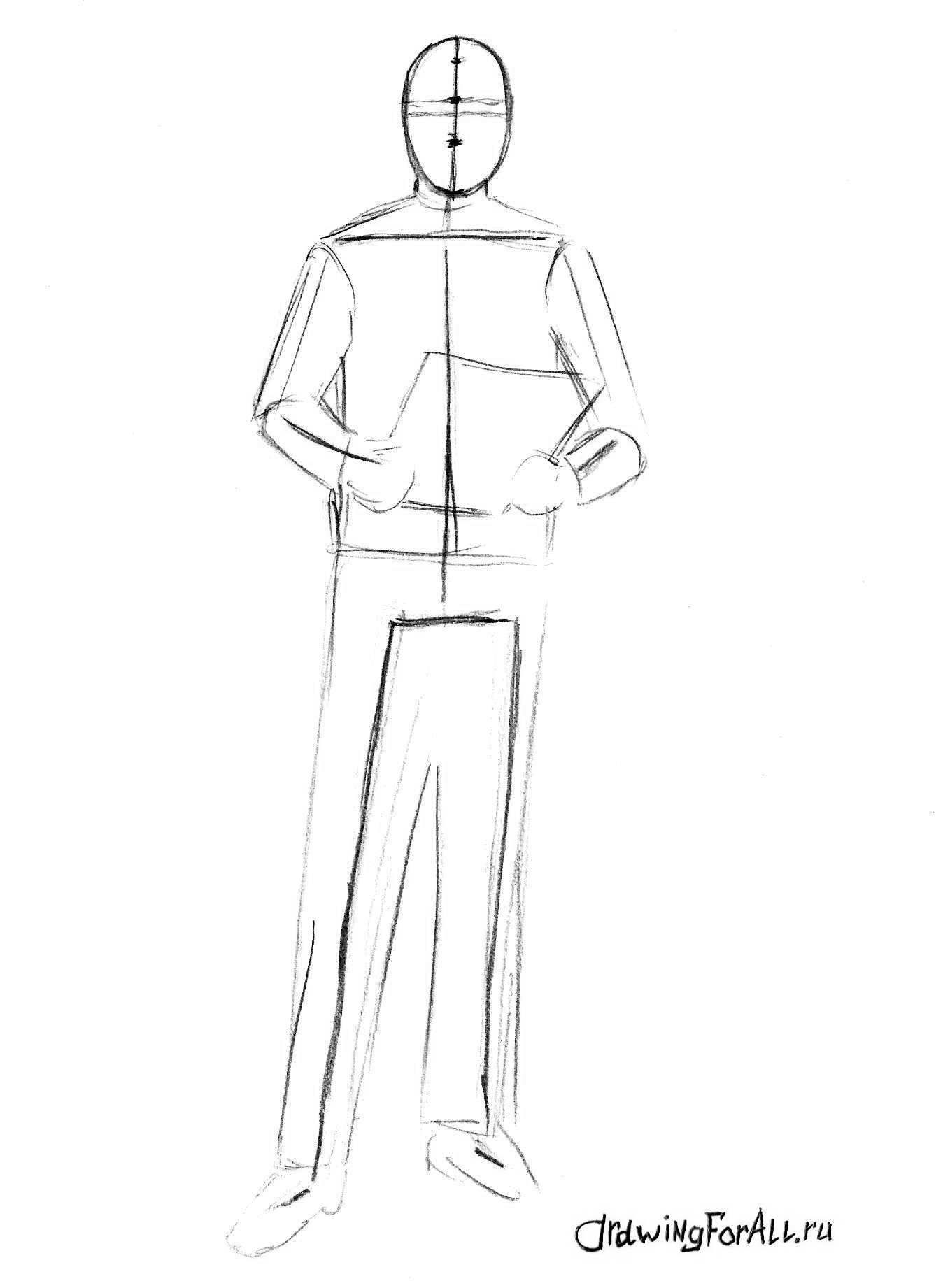 Все эти линии находятся на примерно одном расстоянии. После того как обозначили все линии на голове, переходим к туловищу и рукам. Руки обозначаются цилиндрами, ладони — кругами, в руках намечаем нет, не , а старые добрые листы документов. Обозначаем ноги легкими штрихами и двигаемся далее.