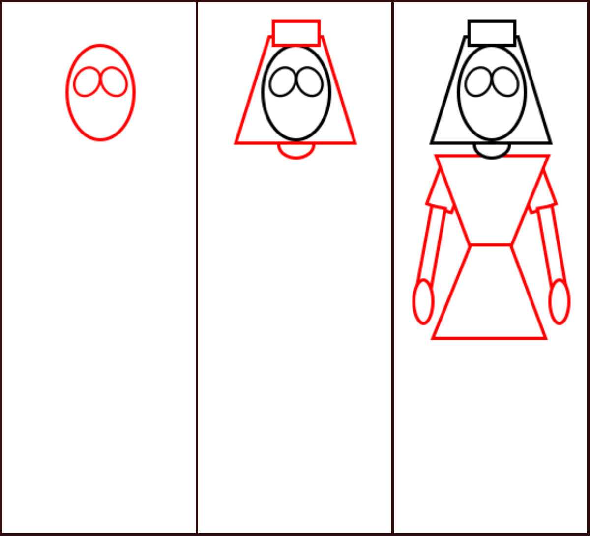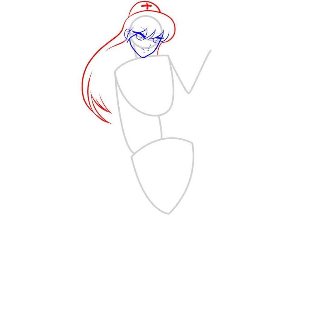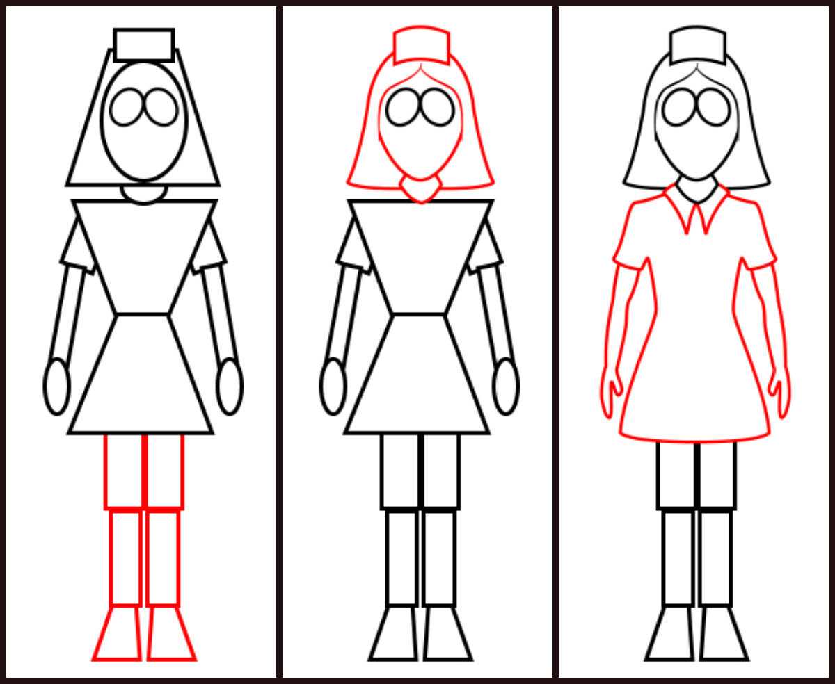 - туловище медсестры набросать в виде двух трапеций, а после закруглить их, чтобы получился халат до колена