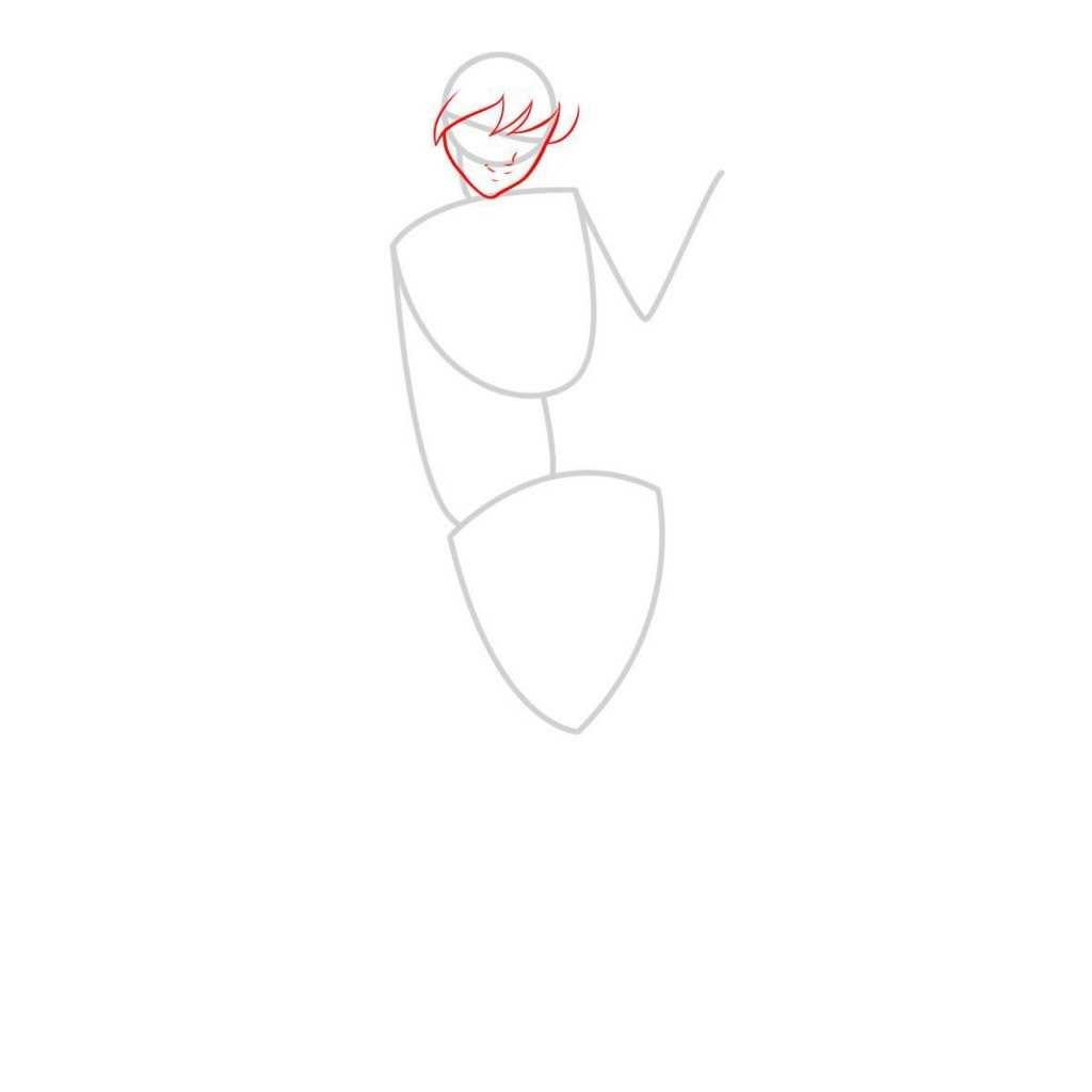 Итак, с начальными этапами мы закончили и приступаем к детализации, начиная, как всегда, с головы. Рисуем волосы легкими длинными черточками. Не нажимайте слишком сильно на карандаш, линии должны получиться не слишком жирными. Линии рисуем по направлению волос, то есть в данном случае снизу вправо и вверх, а на висках от лица и в стороны