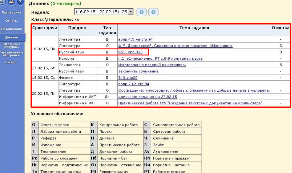 На главной странице электронного дневника выложена информация о занятиях, домашней работе и отметках. Чтобы узнать задание по конкретному предмету, нажмите на него. Появится окошко с подробным описанием домашнего задания.