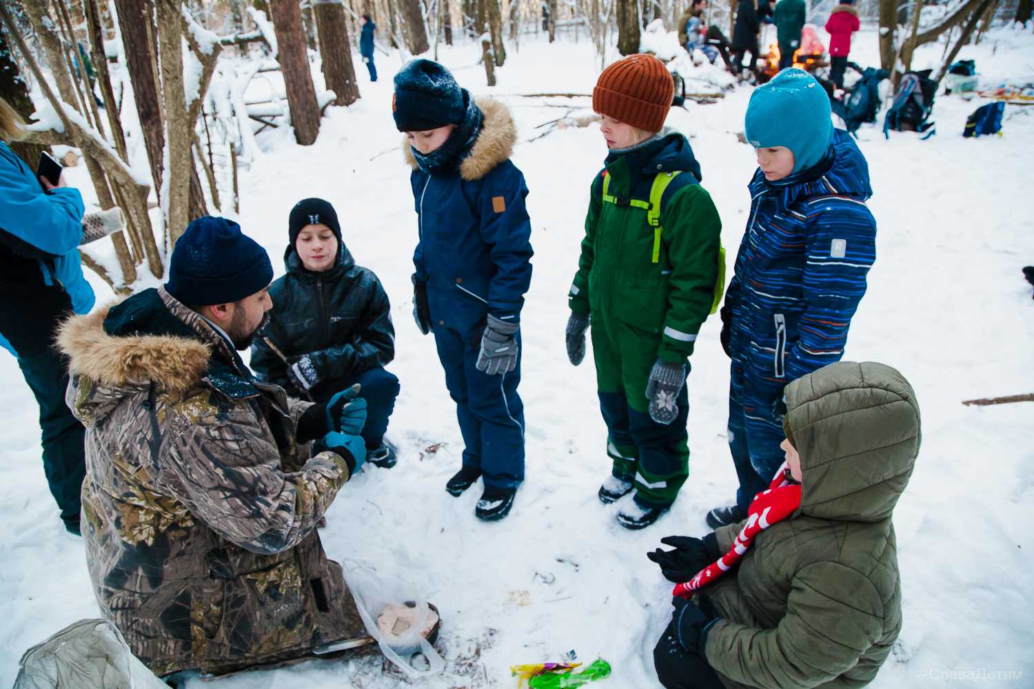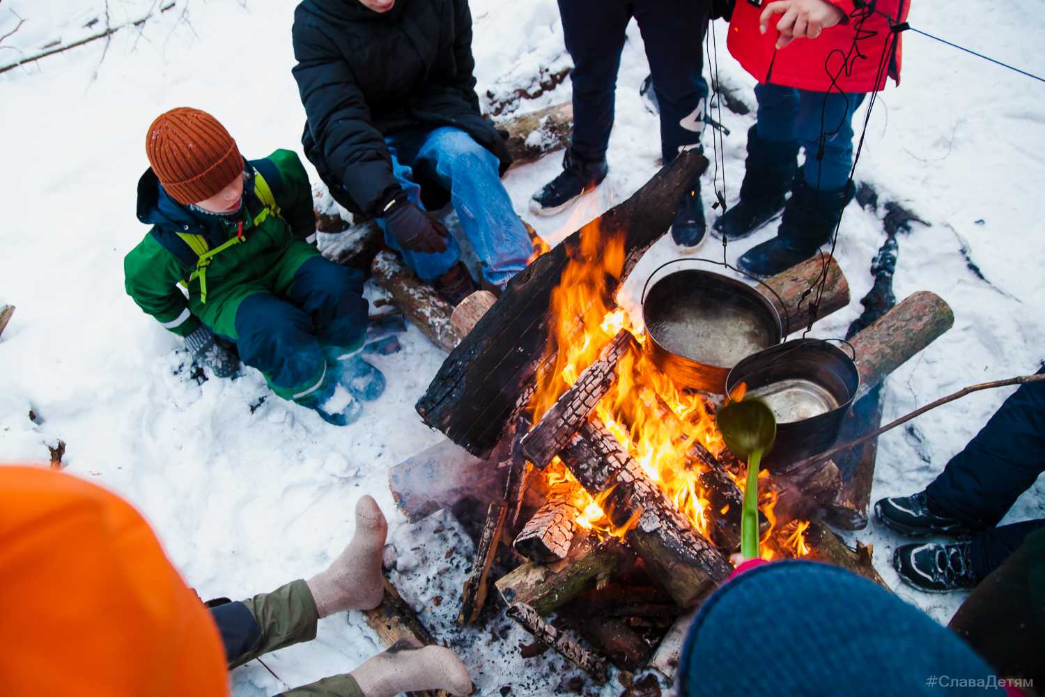 Если в лесу не холодно и много снега, можно построить из сугробов зимний дом, соорудить домик из палочек, поиграть в снежки, чтобы согреться. Пробежка по снегу, хождение по сугробам, приседания и подготовка дров — все это здорово помогает согреться, о чем нужно обязательно рассказать детям.