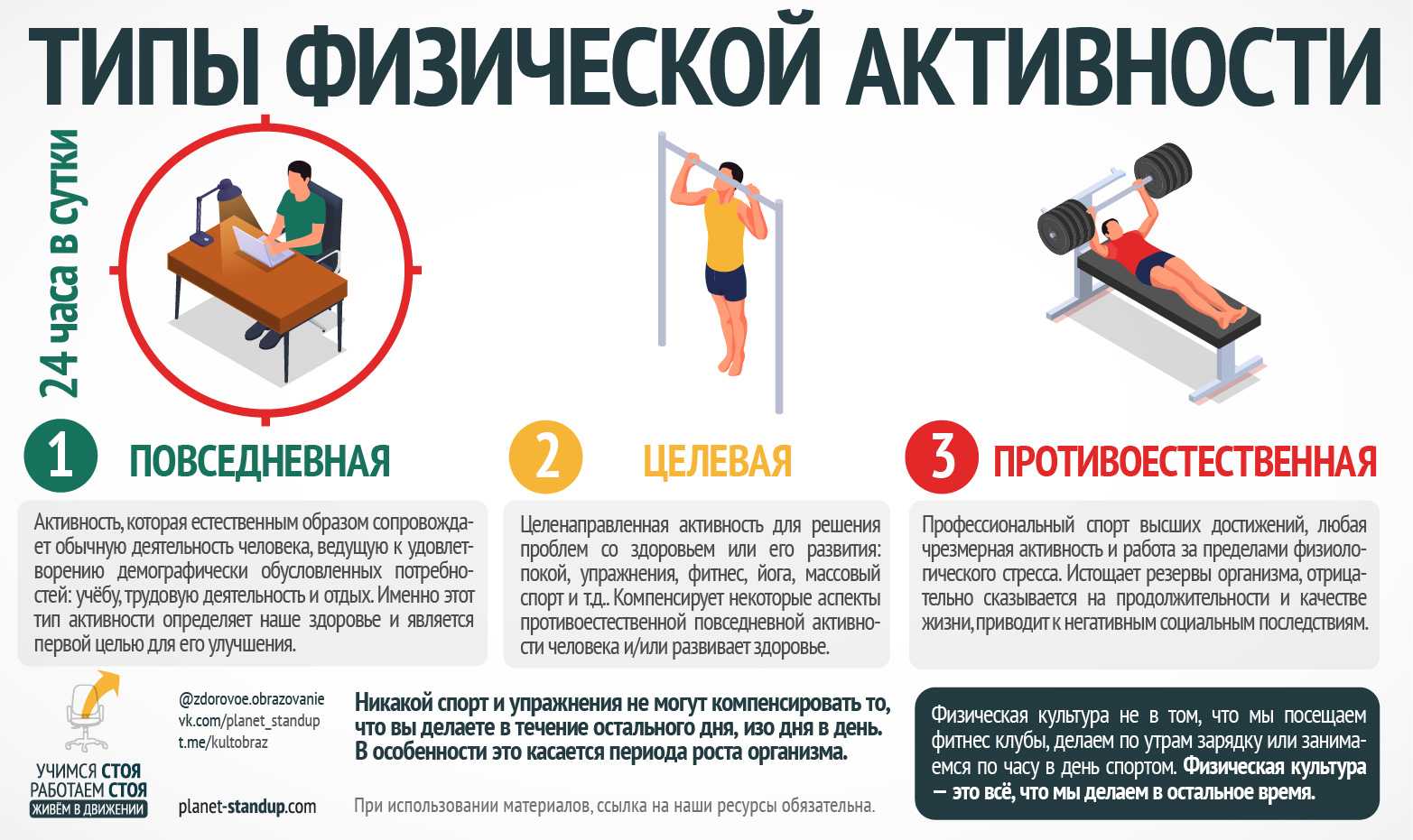 - Повседневная активность. Активность, которая естественным образом сопровождает обычную деятельность человека, ведущую к удовлетворению демографически обусловленных потребностей: учёбу, трудовую деятельность и отдых. В большинстве случаев это будет 24 часа в сутки. Для более чем 80% жителей нашей страны — это вся, активность, которая есть. Именно повседневная активность определяет наше здоровье.