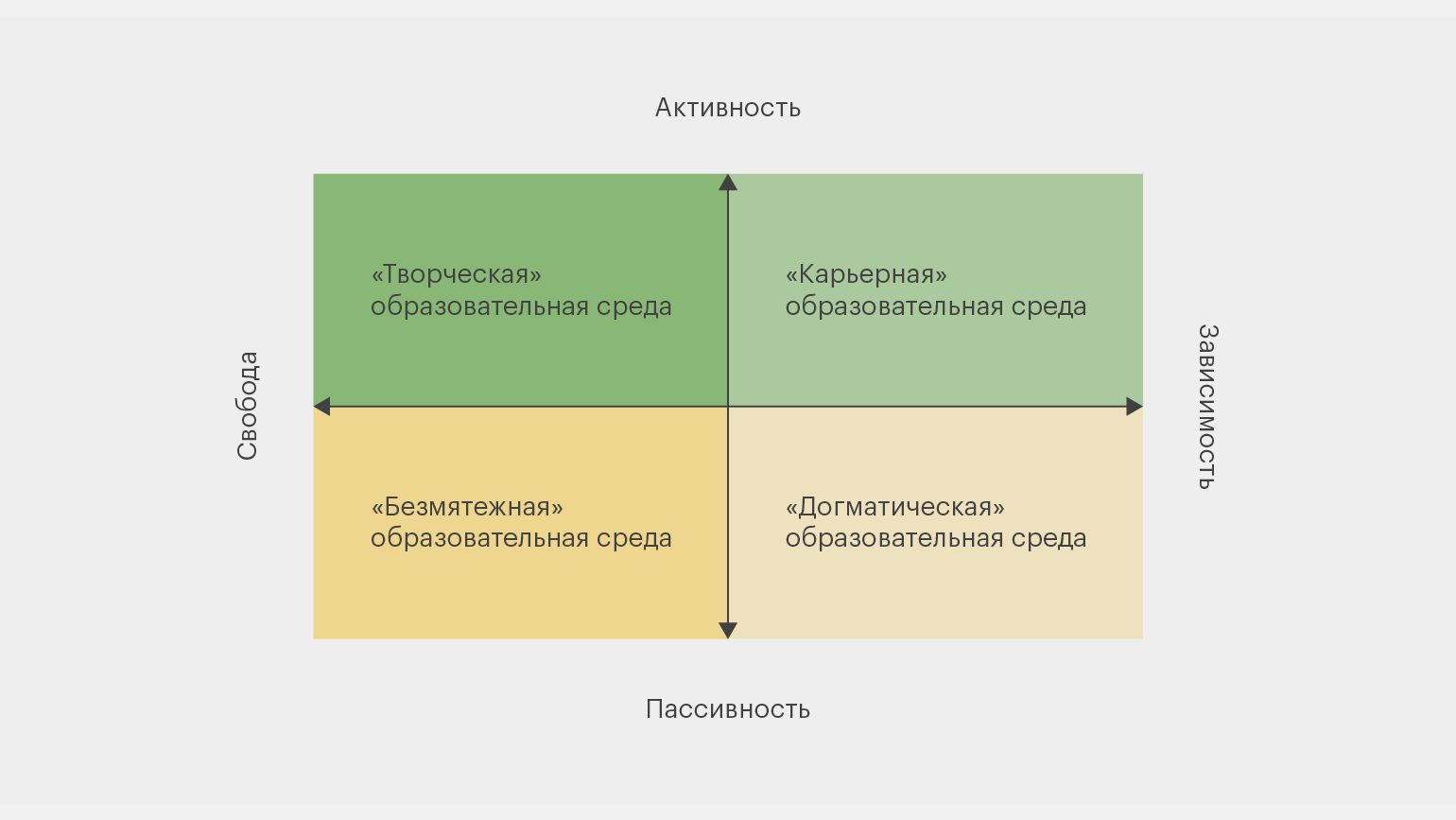 Эта методика представляет собой систему координат из двух осей: «свобода — зависимость» и «активность — пассивность». Хотя речь в ней идёт о детях, с её помощью можно продиагностировать любую образовательную среду — не только в школе, но и там, где учатся взрослые.