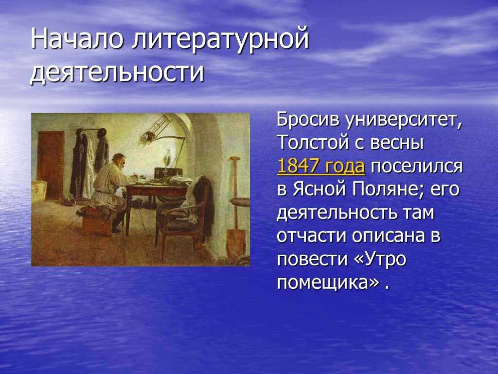 Рассказ «Утро помещика» носит автобиографический характер и связан с крупнейшим замыслом молодого Толстого — «Романом русского помещика».