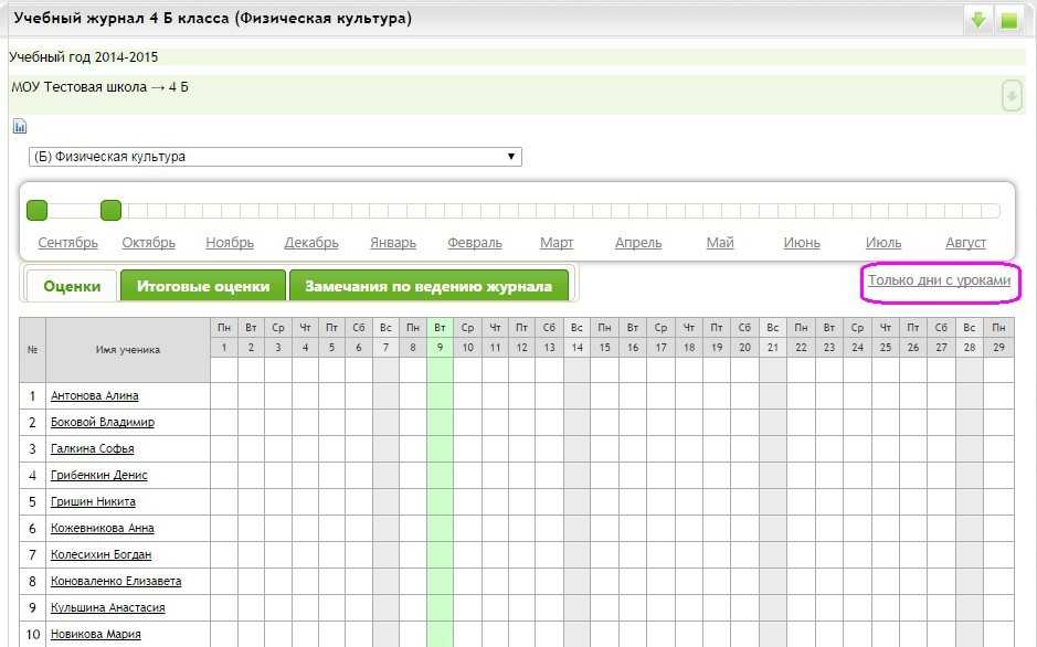 При помощи стрелочки можно перемещаться по классам и параллелям.