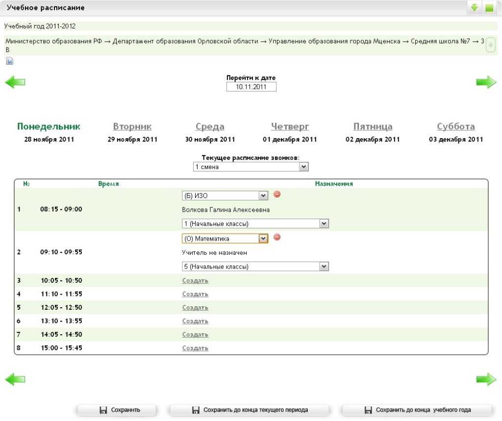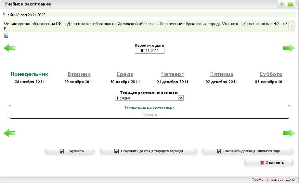 Для начала следует выбрать расписание звонков. Далее нажать «Создать», раскрывается расписание на день. Для добавления урока нажать «Создать». После этого выбрать предмет, корпус, кабинет. Далее расписание можно сохранить на текущий день, текущий период (четверть, триместр) или весь учебный год.