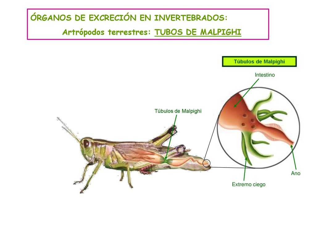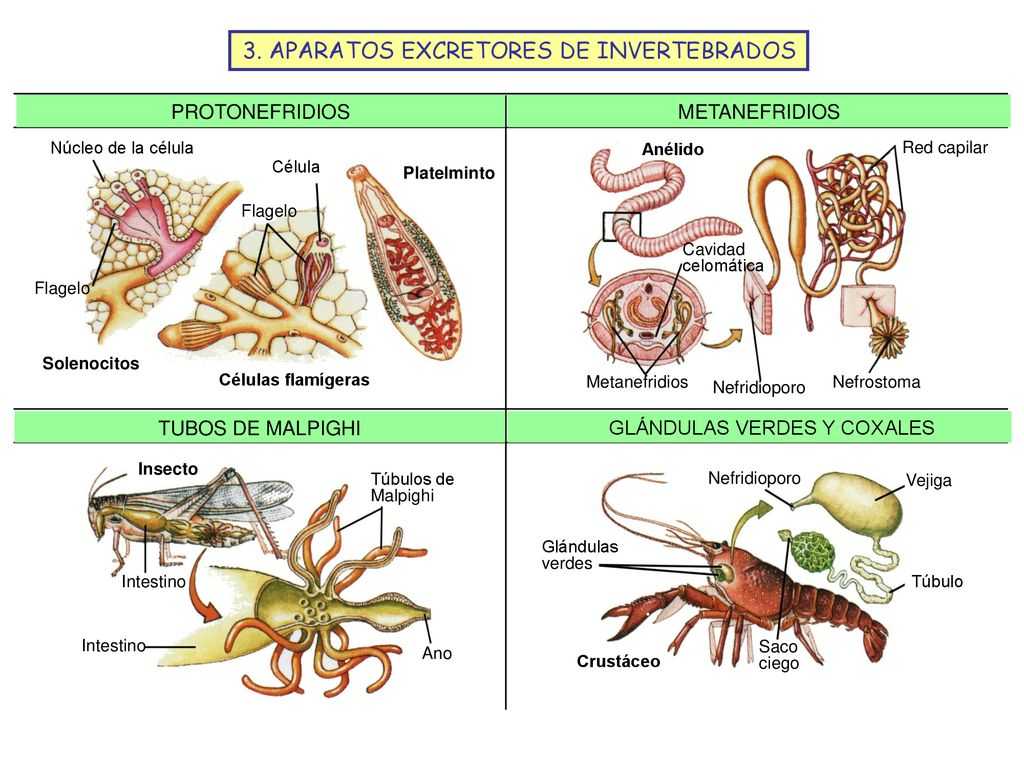 Членистоногие, такие как ракообразные, имеют зеленые железы в качестве выделительного аппарата, они имеют форму мешочков и соединены с мочевым пузырем с помощью длинной трубочки с нефридиопором, через который они выделяют выделяемые вещества. Между тем у других членистоногих есть канальцы, которые также связаны с кишечником.