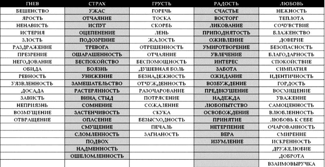 И еще хочу показать вам сборник чувств, эмоций, состояний, которые испытывает человек в течение своей жизни — обобщенная таблица, которая не претендует на научность, но поможет лучше понять себя. Таблица взята с сайта «Сообщества зависимых и созависимых», автор — Михаил.